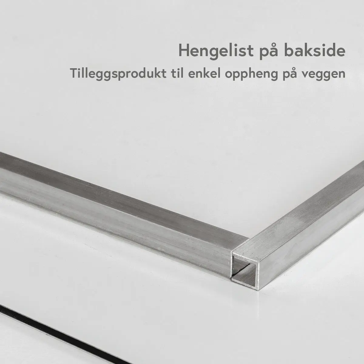 10mm aluminium hengelist på baksiden av platen. Listen limes med epoksi på plate og gir meget god feste. Til veggmontering uten rammer, festes med to skruer. Meget enkel, solid og langvarig hengeløsning til harde plater som alu eller iBond.