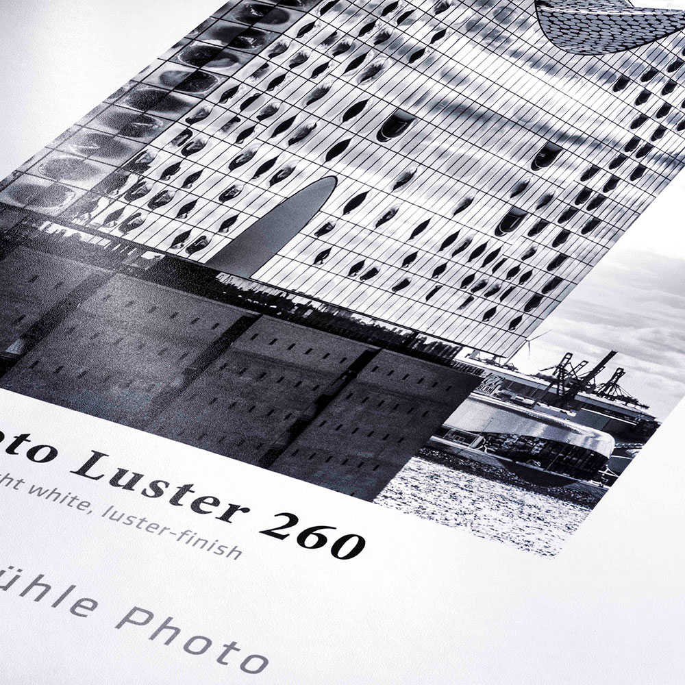 Hahnemühle Photo Luster 260 er et lys hvitt fotopapir med luster-overflate som gir god dybde og detaljer, samtidig som det er mer praktisk og mindre speilblankt enn høyglans. Resin-coated (RC/PE) gir god holdbarhet og stabil håndtering.